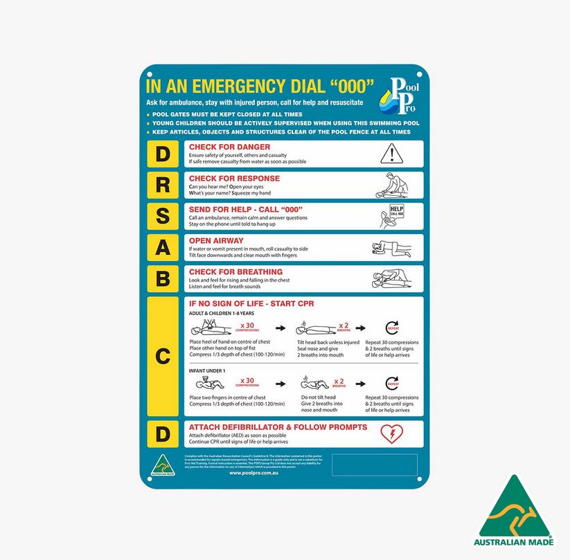 Large Polypropylene resuscitation sign. Australian Made. Size: 410mm x 600mm. Complies with Australian Resuscitation Council Guidelines.